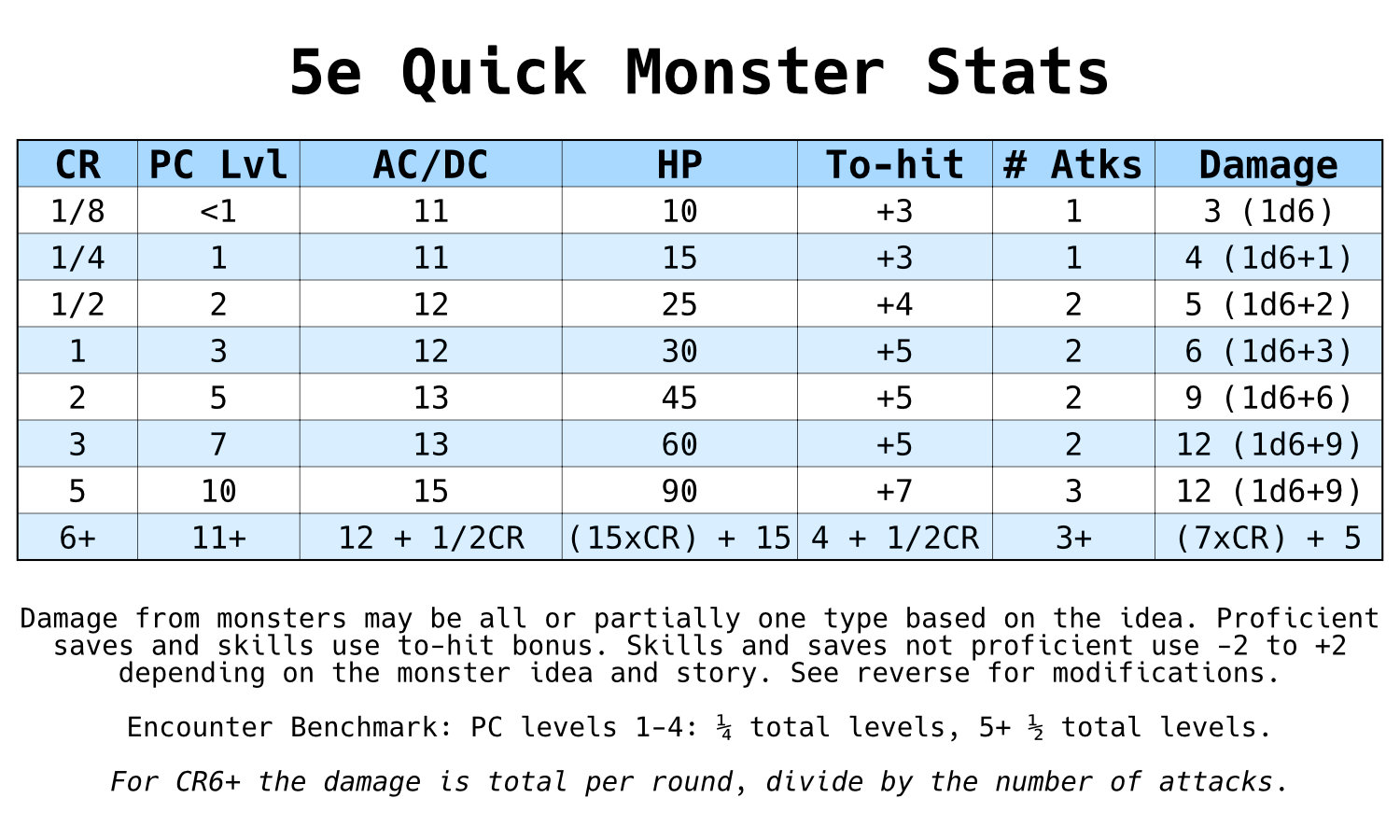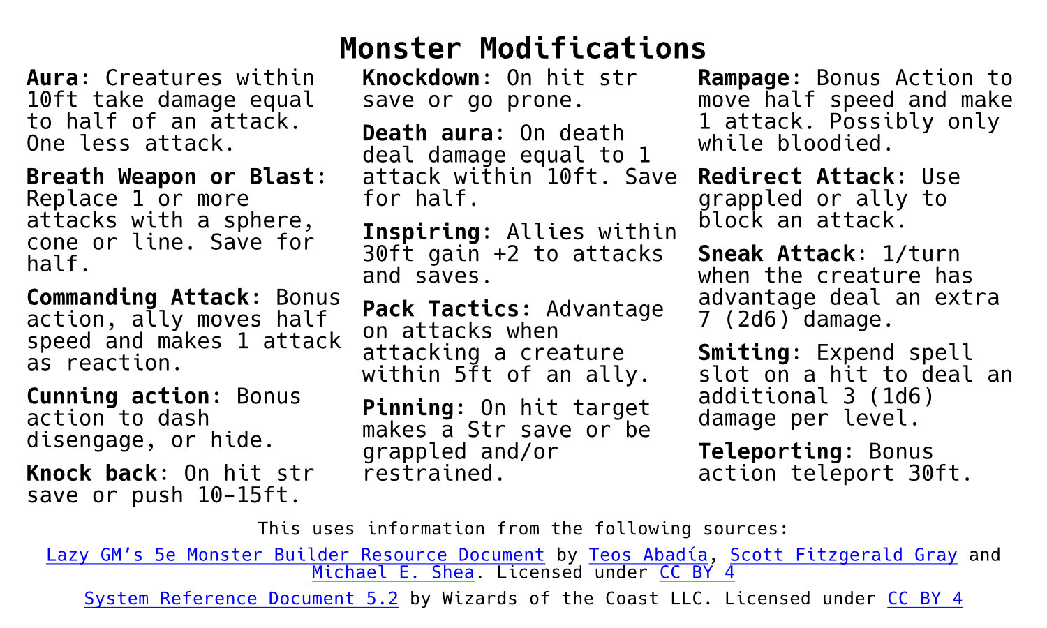 - Lazy GM’s 5e Monster Builder Resource Document by Teos Abadía, Scott Fitzgerald Gray and Michael E. Shea. Licensed under CC BY 4